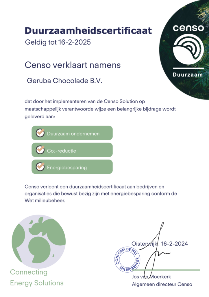 Door het implementeren van de Censo Solution wordt Geruba Chocolade op maatschappelijk verantwoorde wijze een belangrijke bijdrage geleverd aan duurzaam ondernemen, CO2-reductie en energiebesparing.